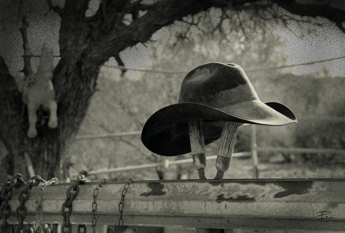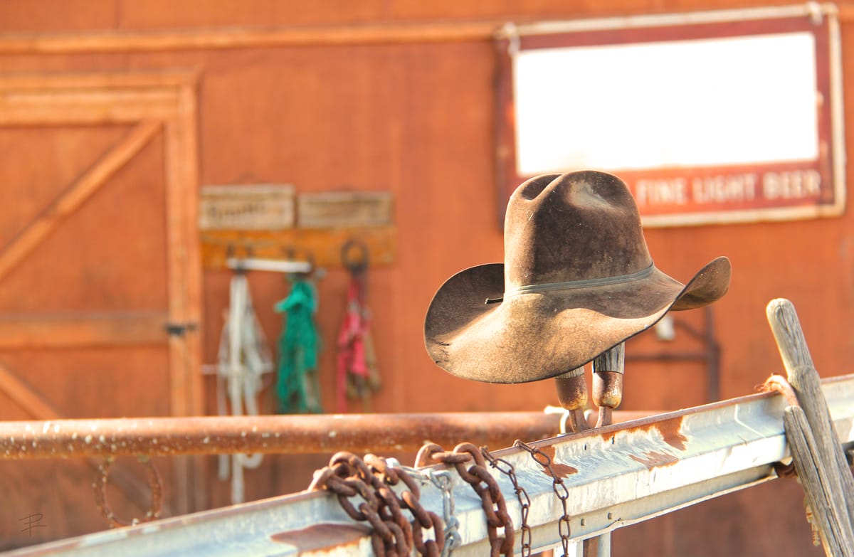Ahh, look at this! So wholesome and sunny - a hint of daily ranch life where people work hard for their happiness. This cowboy is probably somewhere in the shade, taking a break from his labors. Maybe having a ham sandwich with a soda pop.